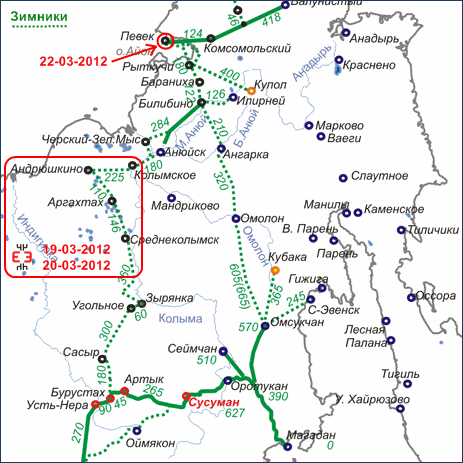 25-03-2012. Певек — конечная точка маршрута для Кукусика. Его экипаж вместе с автомобилем улетит в Магадан и оттуда в Москву, а караван патрулей двинется к Чукотскому морю через зимники. Небольшая передышка, традиционный ремонт автомобилей и завтра в путь.