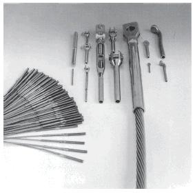 Для стоячего такелажа, преимущественно, используется жесткий нержавеющий трос 1X19 DIN 3053 имеющий 19 жил в одной каболке. Этот же трос целесообразно использовать для леерного ограждения без оплетки. В зависимости от необходимого типа крепления на концах троса устанавливаются, как правило, наконечники типа вилка ART 8280 или ухо ART 8281. Возможна установка наконечников с резьбой типа 8307 или 8467, T-терминалов типа 8282 под гнездо 8302. Иногда конструктивно целесообразно использовать талрепы под обжим типа 8275 или 8276, но нужно иметь ввиду, нержавейка имеет свойство "закусывания" резьбы, особенно на больших диаметрах M10 и выше и при этом потребуется менять ванту целиком, ввиду невозможности исправить "закусывание". Крайне редко используется терминал-крюк 4865 на рангоуте старых конструкций.